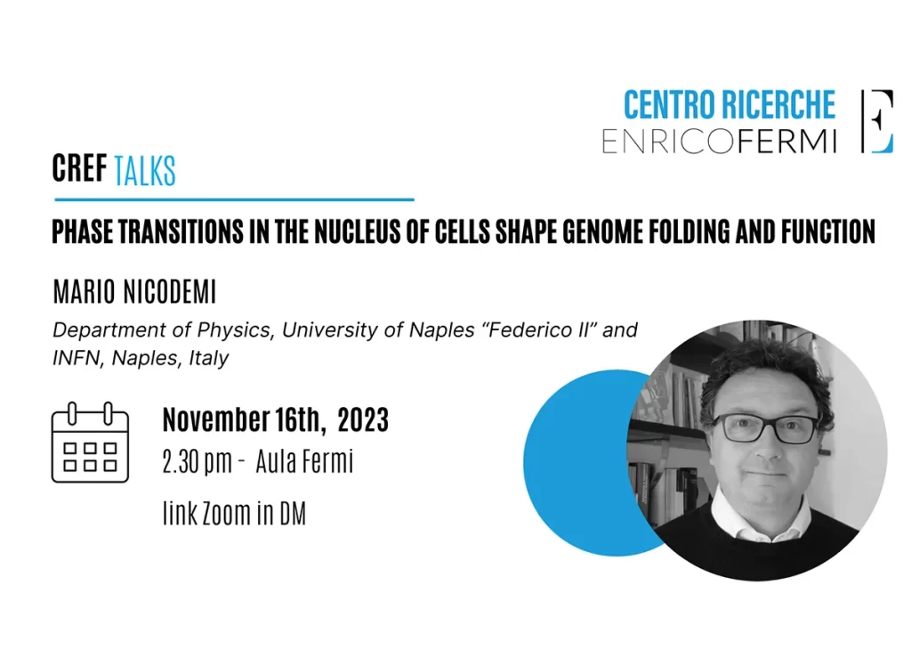 CREF TALK November 16th, 2023 – 2.30 pm Phase transitions in the nucleus of cells shape genome folding and function Mario Niccodemi, Department of Physics, University of Naples “Federico II” and INFN, Naples, Italy. In the nucleus of cells, the human genome has a complex 3D organization that serves vital functional purposes as, for instance, […]