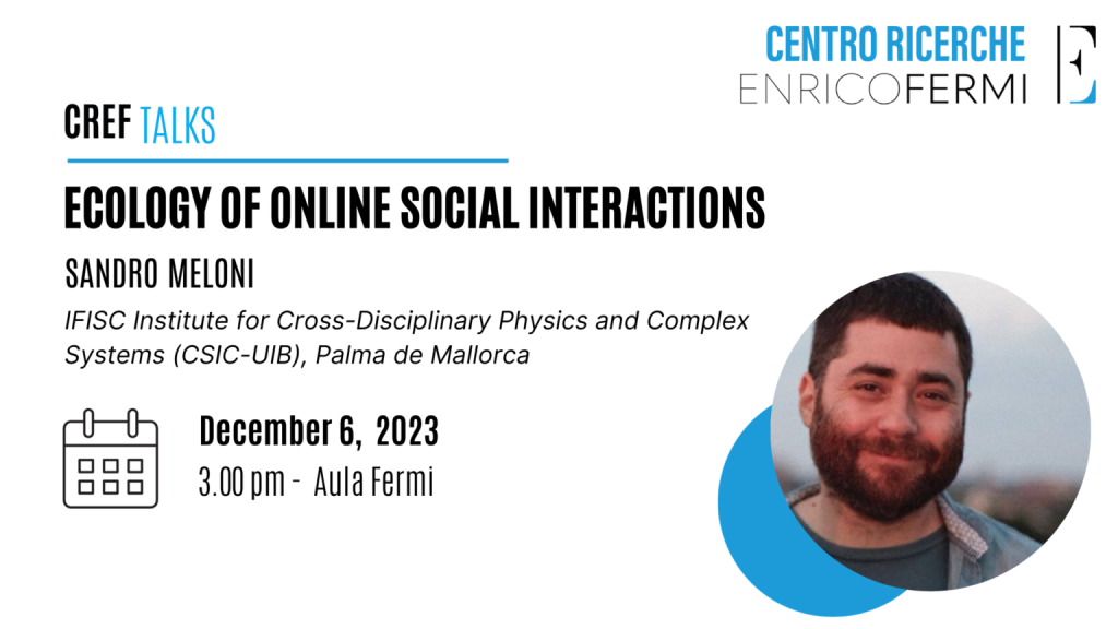 Ecology of Online Social Interactions CREF Talk December 6, 2023 15h, Aula Fermi Speaker Sandro Meloni IFISC Institute for Cross-Disciplinary Physics and Complex Systems (CSIC-UIB), Palma de Mallorca Abstract Online social networks have significantly changed global communication dynamics and, in general, the way we interact. Along with these profound effects on our society, they also […]
