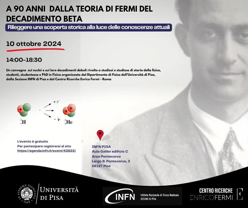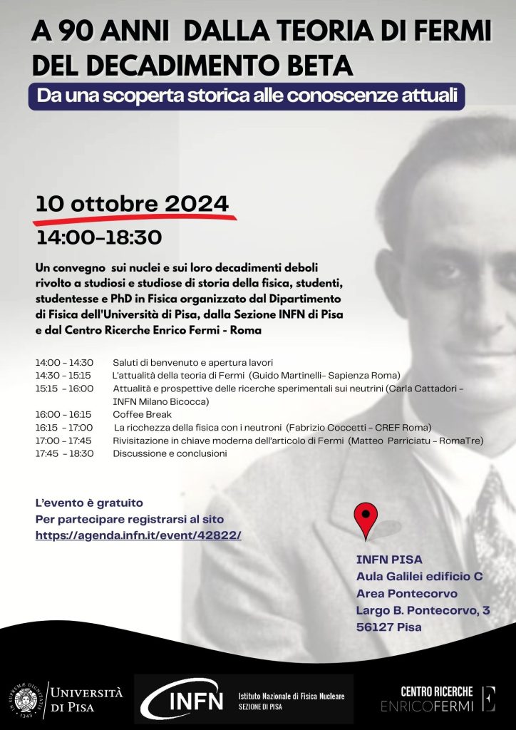 Il 10 ottobre 2024 il Centro Ricerche Enrico Fermi, il Centro Pontecorvo del Dipartimento di Fisica dell’Università di Pisa e la Sezione di Pisa dell’Istituto Nazionale di Fisica Nucleare organizzano un convegno per celebrare i novanta anni dalla pubblicazione da parte di Enrico Fermi dell’articolo “Tentativo di una teoria dei raggi beta”.